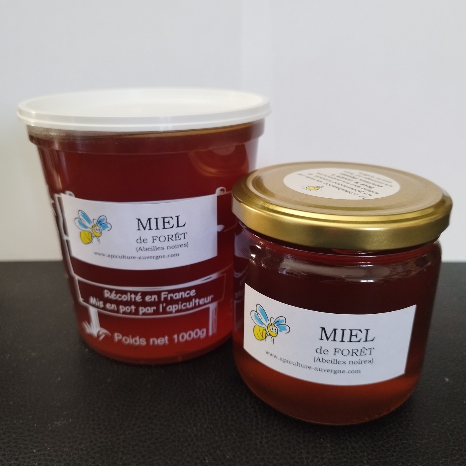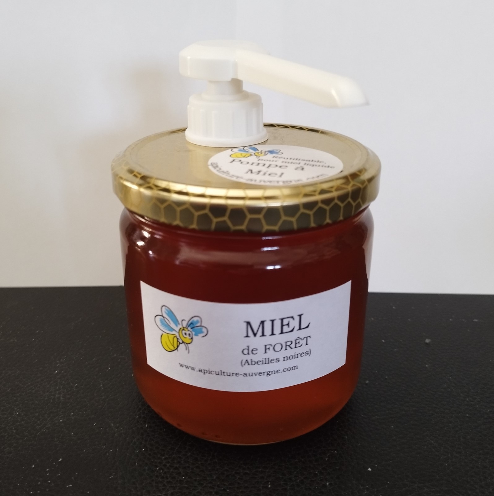 disponible en pot de 1kg, 500g et 500g avec pompe à miel. Récipient en verre (500g) ou plastique alimentaire (1kg).